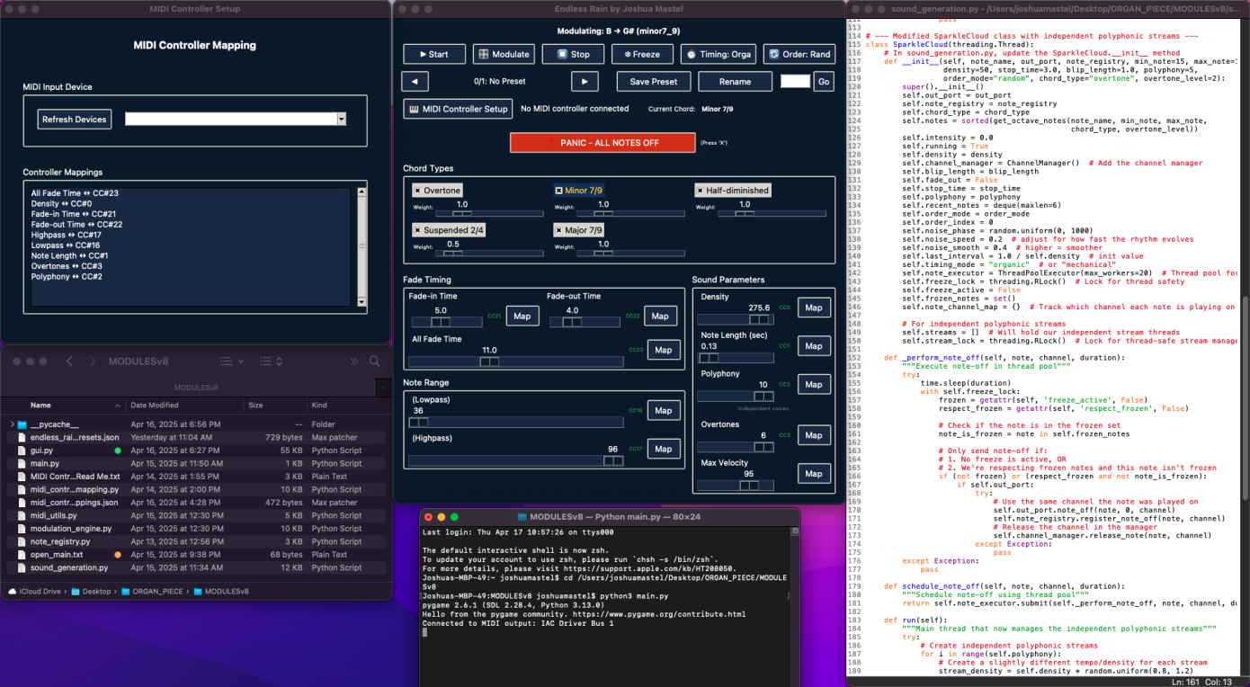 This piece uses python code to control a MIDI-operated pipe organ via a graphical user interface on the computer that allows the performer to manipulate various musical parameters in real-time, such as register, stochastic density, sustain, and modulation. The system continuously generates sparkling clouds of pitches which modulate across tonal centers following a logic inspired by Riemannian modes of harmonic shift. I think of the organ here as a kind of sleeping leviathan having dreams of rain.