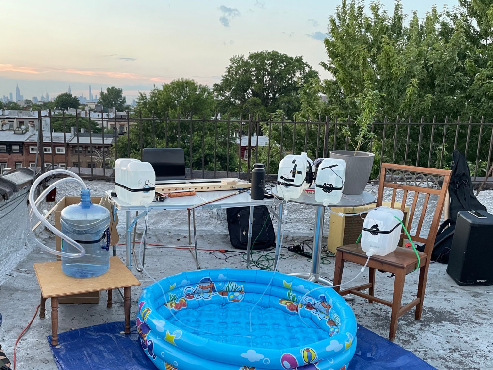 a live set performed on a rooftop in Bed-Stuy, Brooklyn in July 2022. Setup involves six custom-made "feedback jugs" built from plastic water jugs with small feedback devices attached to them. The resonant frequency of the feedback is modulated by changing the volumes of water contained in each jug and emptying the water into adjacent jugs and finally into a kiddie pool on the ground. The set also uses a homemade electric wind harp, a small bell, and fixed media.